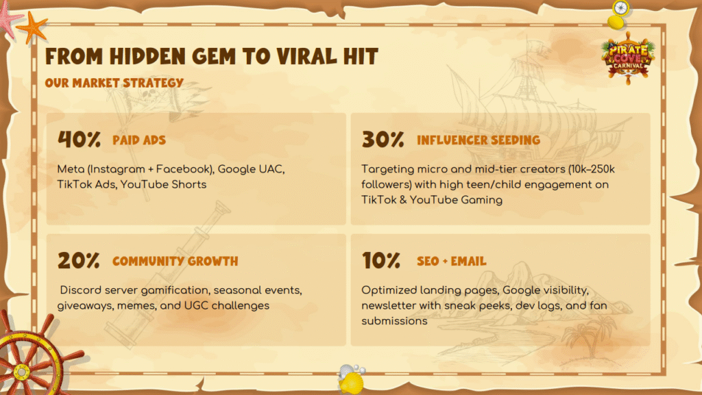 Pirate Cove Carnival is designed to scale from a niche community into a viral success. Our strategy combines paid ads across Meta, Google UAC, TikTok, and YouTube Shorts with targeted influencer campaigns. By working with micro and mid-tier creators, we ensure authentic engagement with young audiences and expand our reach across key platforms where players spend their time. This blend of advertising and influencer presence helps maximize visibility at a sustainable cost.